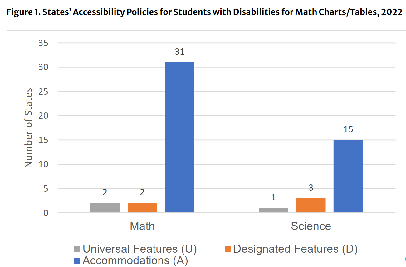 Aux États-Unis, chaque état détermine quelles adaptations sont permises, tout comme au Canada, chaque province se positionne à cet égard. Je me suis questionnée si la table de Pythagore (une vraie de vraie table complète) était permise autre part, comme mesure d'adaptation (et non de modification). Il s'avère que nos voisins américains la permettent en majorité. En effet, 33 états considèrent la table de Pythagore comme une adaptation (Designated features et Accomodations sont deux formes d'adaptations) et 2 états la permettent même en tout temps à l'ensemble des élèves (voir figure ci-dessous, tirée de https://publications.ici.umn.edu/nceo/accommodations-toolkit/math-charts-tables-policies) :