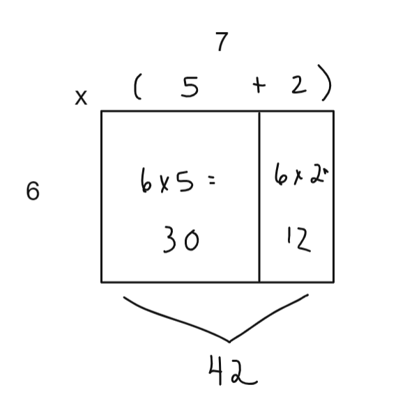 Prenons l'exemple de la distributivité. Traditionnellement, l'élève apprend une définition de cette propriété et s'exerce à reconnaître des exemples de celle-ci. Il aura également souvent à démontrer que cette propriété est vraie en validant que les deux côtés d'une équation (ex. : 3 x (40 + 5) = 3 x 40 + 3 x 5) sont effectivement équivalents. Puis, la procédure pourra devenir fluente si l'élève s'exerce suffisamment à calculer en se basant sur la propriété de la distributivité (ex. : 3 x (40 + 5) = ...). Ayant l'expérience de cette procédure réalisée maintes et maintes fois, l'élève pourra s'y référer pour approfondir ensuite ses connaissances conceptuelles de la distributivité. Notamment, des représentations semi-concrètes permettent d'illustrer qu'il s'agit d'une stratégie back-up courante lorsque le rappel d'un fait multiplicatif échoue (voir ci-dessous la stratégie appliquée au fait 6 x 7, le 7 étant ici décomposé en "5 + 2").