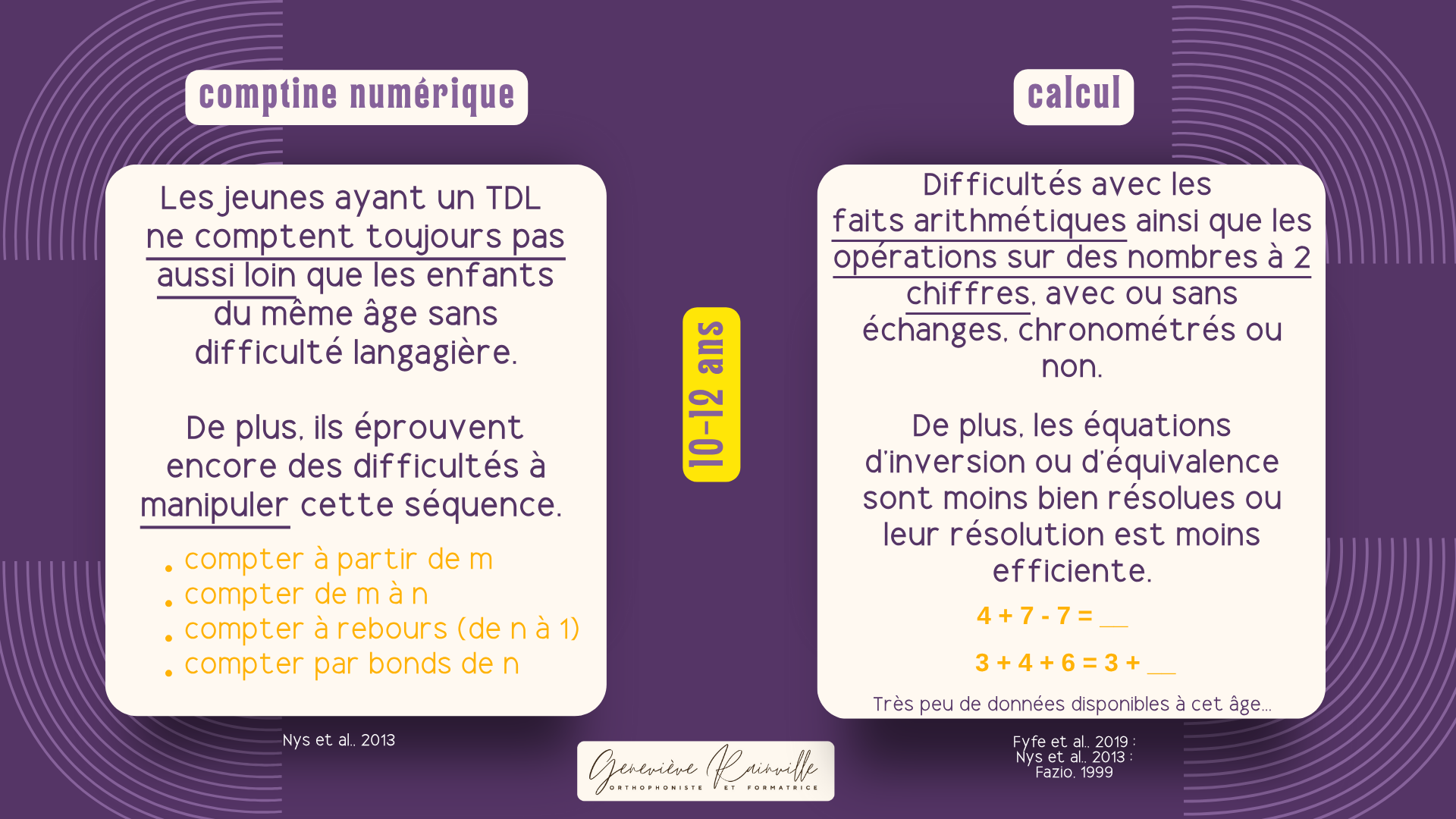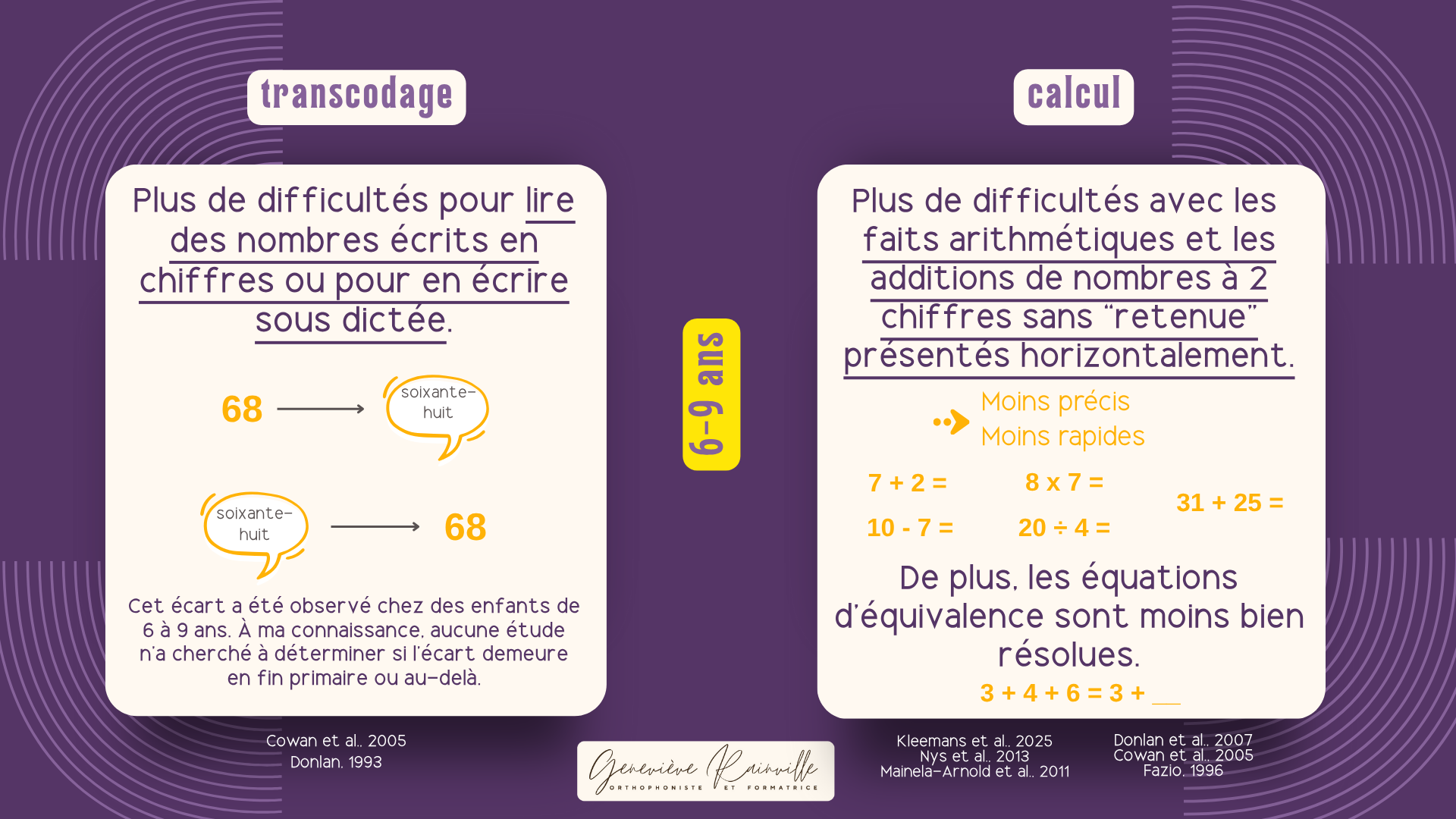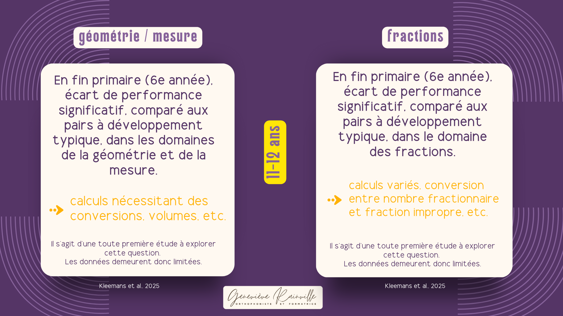 Dans l’ensemble, ces travaux longitudinaux confirment que les difficultés mathématiques des élèves présentant un TDL persistent dans le temps, tendent à s’aggraver pour certaines compétences plus complexes, et sont encore amplifiées lorsqu’elles s’accompagnent de difficultés de lecture.