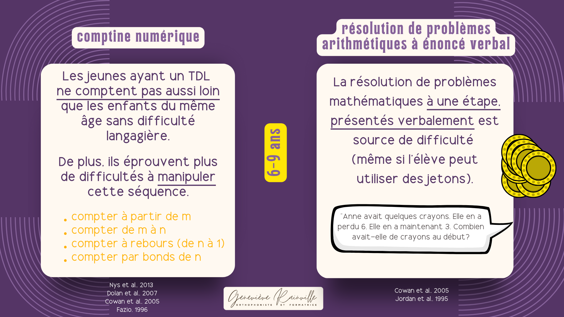Il importe de souligner que les études demeurent somme toute encore peu nombreuses, et qu’à ma connaissance, aucune n’a encore porté spécifiquement sur des participants ayant un TDL au secondaire. Ce constat nous amène naturellement à nous demander comment les difficultés en mathématiques évoluent, au-delà du primaire. Je serais tentée de formuler quelques hypothèses, basées sur les données actuelles de la littérature ainsi que sur mes observations cliniques.