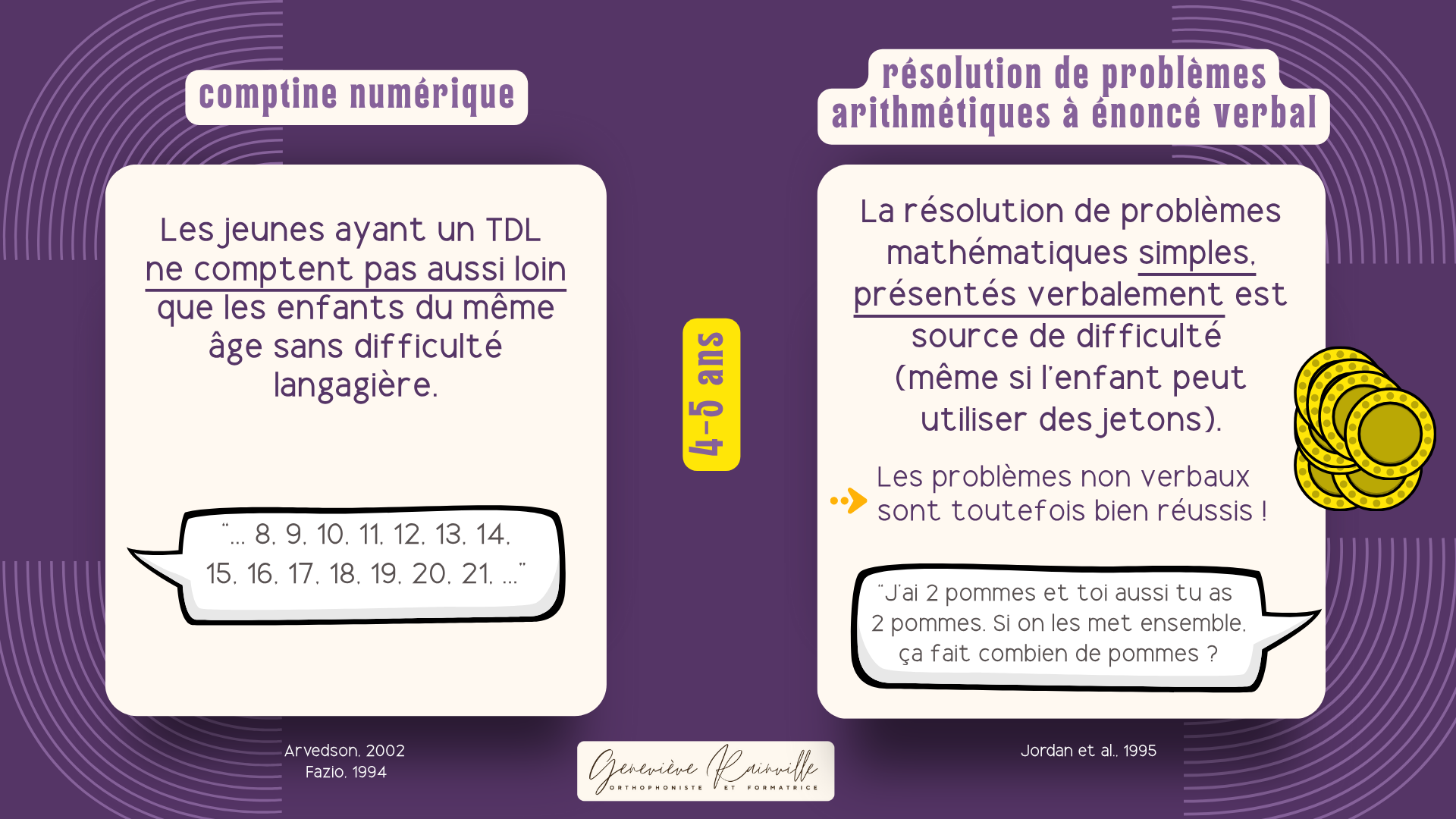 Dans ce billet, j'ai tenté de dresser le portrait des compétences mathématiques souvent faibles chez les jeunes présentant un TDL, et ce, à l'âge préscolaire, comme au primaire. Les difficultés en mathématiques de ces jeunes perdurent dans le temps. Sans intervention ciblée à bon dosage, l'écart avec les pairs à développement typique demeure.